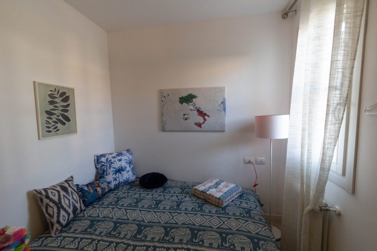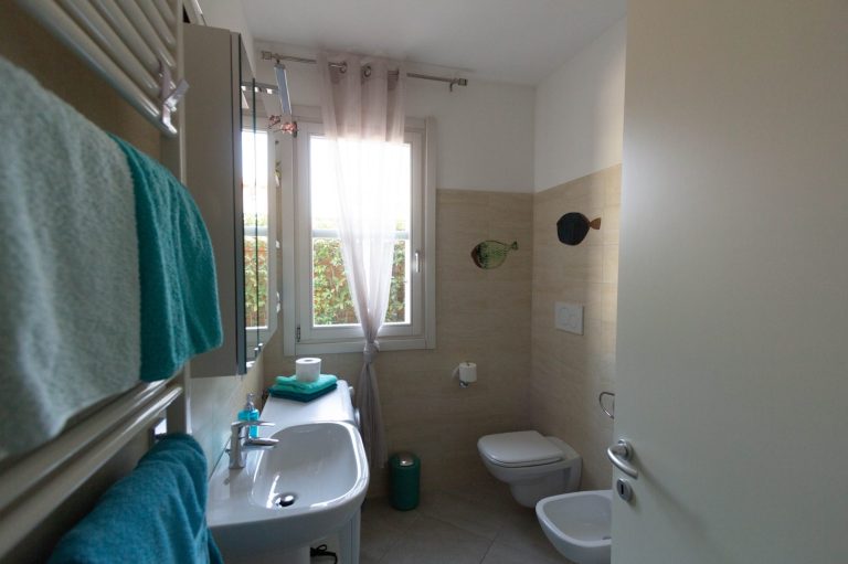 Das Bad ist mit Dusche, WC, Bidet, Waschbecken, Fön und Waschmaschine ausgestattet..