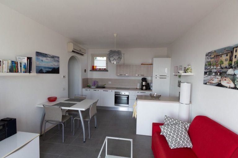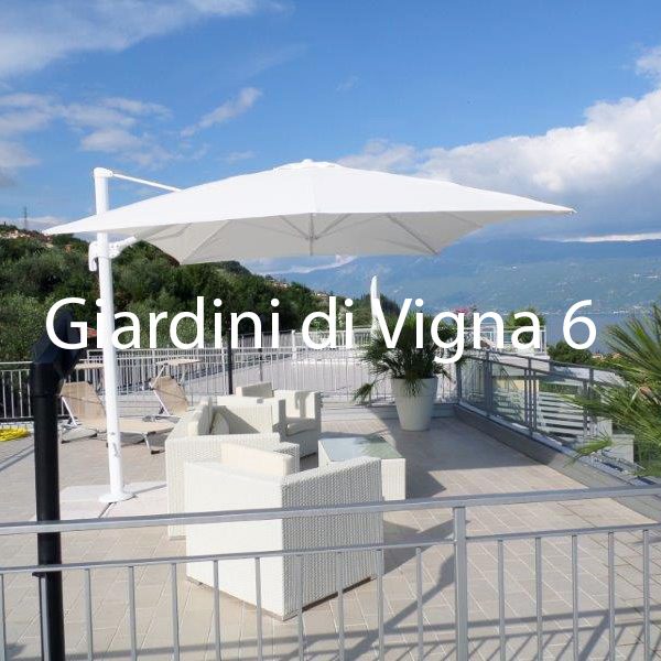 Die Anlage mit insgesamt nur acht Wohnungen und ermöglicht so eine private und individuelle Atmosphäre. In ruhiger Lage, mitten im Grünen, 80 Meter über dem Gardasee bietet die komfortable 2-Zimmer-Wohnung Giardini di Vigna 6, zwei Zimmer, Bad, Veranda und eine große Dachterrasse.