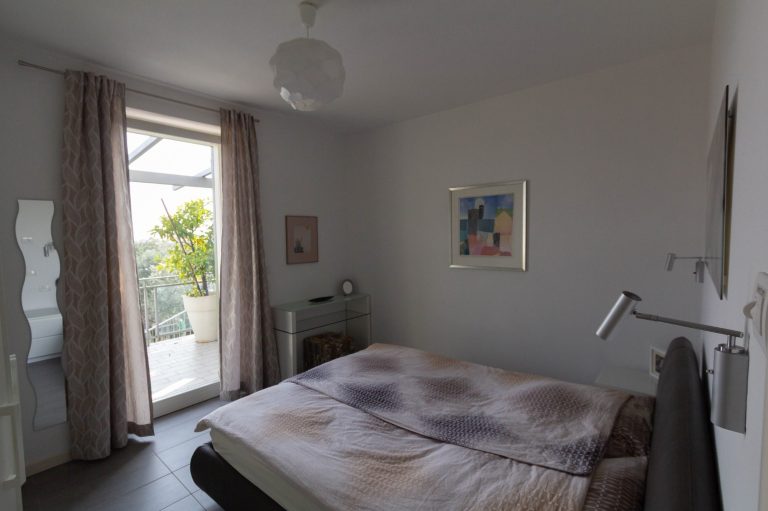 Das Schlafzimmer ist mit einem eleganten Leder-Doppelbett (160x200), Nachtkästchen und einem geräumigen Kleiderschrank ausgestattet. Sie haben vom Bett aus einen schönen Seeblick. Ein Safe steht zur sicheren Verwahrung von Wertsachen zur Verfügung.