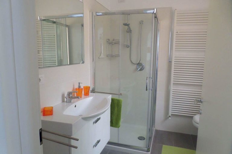 Das Bad verfügt über eine Dusche, WC, großen Waschtisch, Handtuchheizkörper und Waschmaschine. Ein Fön ist vorhanden.