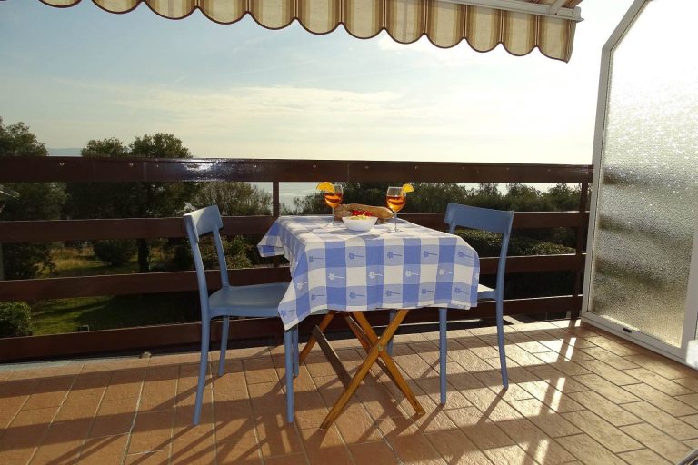 Der 10 qm große Panorama-Balkon mit herrlichem Seeblick hat Tisch und Stühle, Liegestühle, eine Markise und einen Sichtschutz.