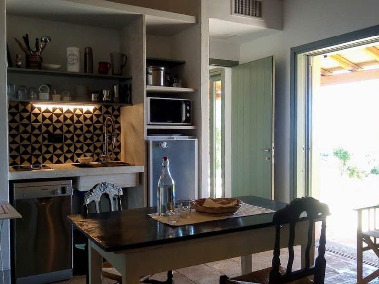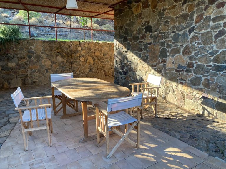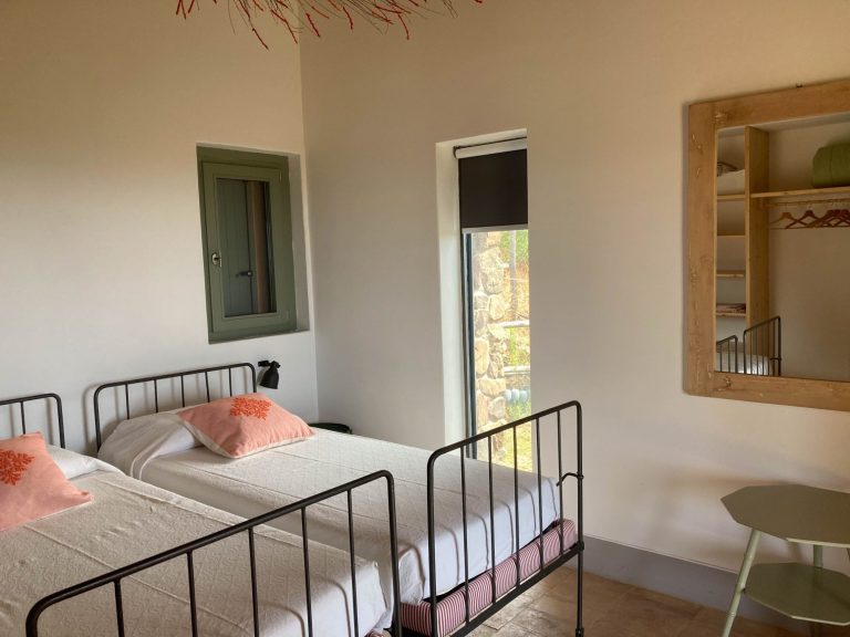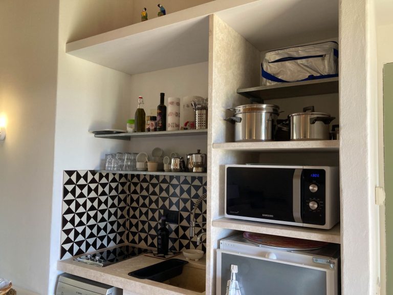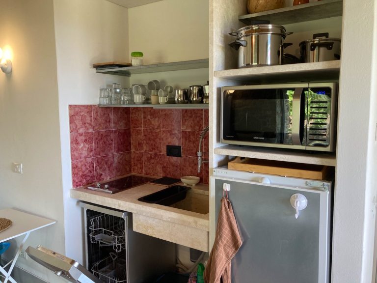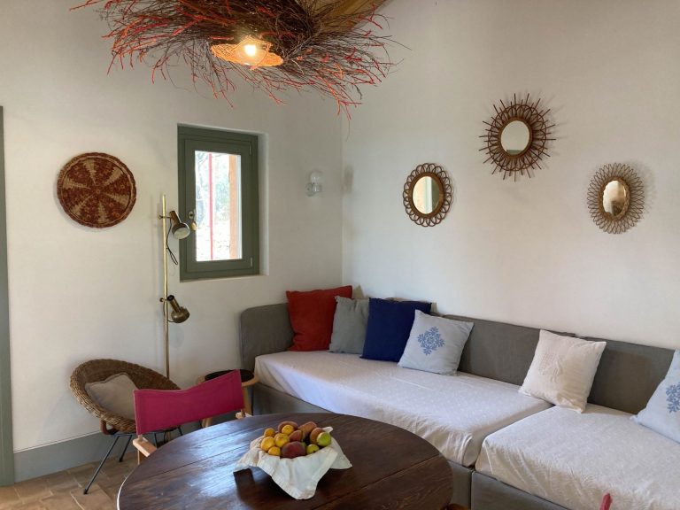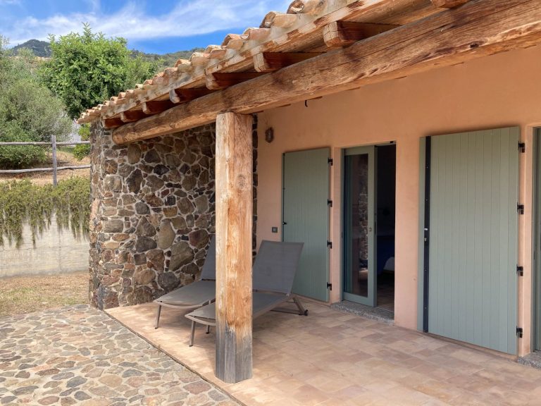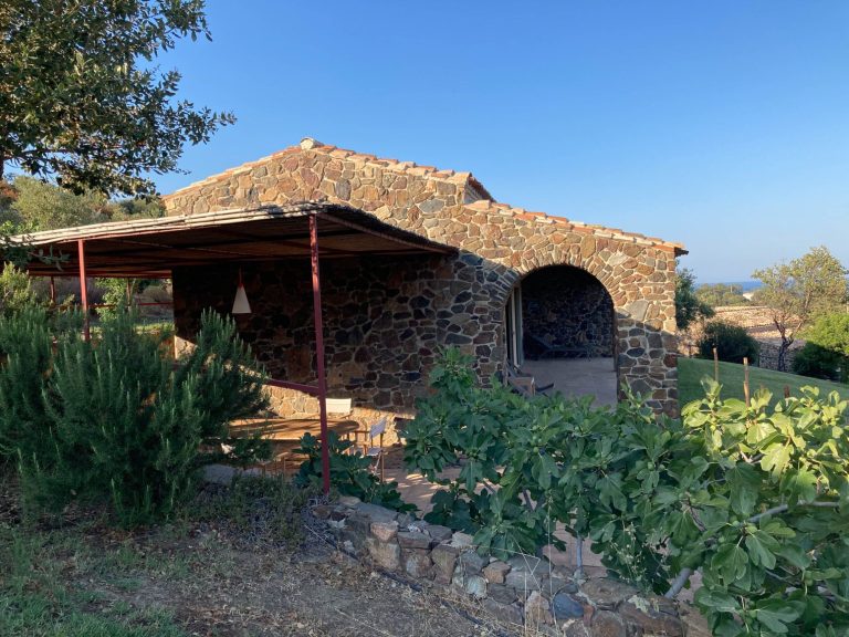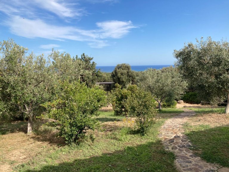 Das Gelände umfasst neben dem Haus der Eigentümerin 4 freistehende Häuschen für jeweils 2 bis 4 Personen, die sich zwischen Bäumen und mediterranen Pflanzen verteilen.