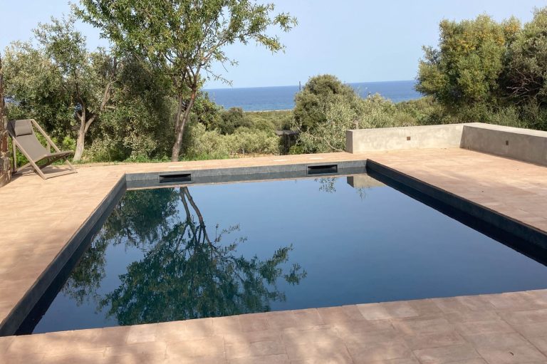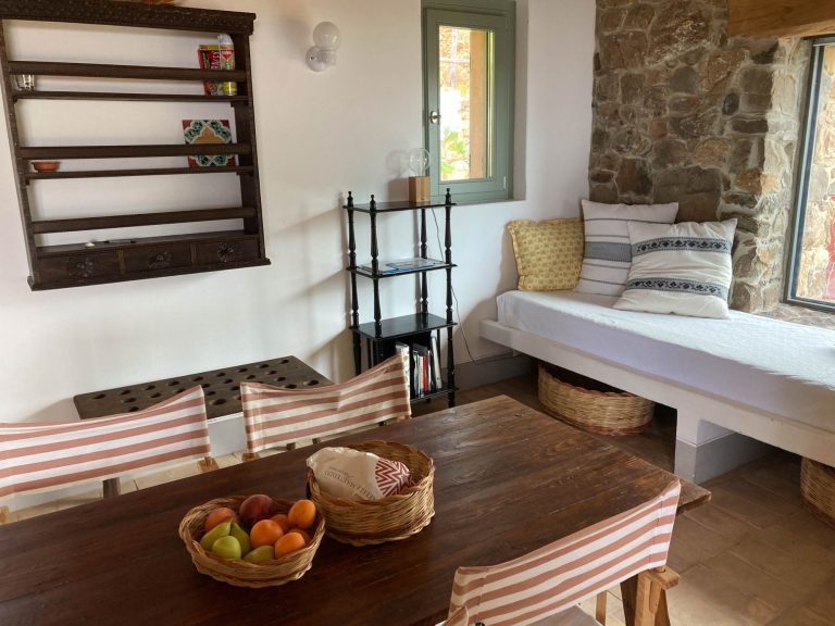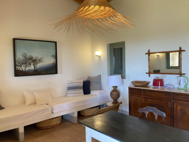 Das gemütliche Haus Squidda hat einen privaten Pool und Meerblick. Es gibt ein Wohnzimmer mit 2 Schlafsofas, Tisch und Stühlen und einer Küchenzeile mit Kühlschrank, Spülmaschine, Ceran-Kochfeld und Mikrowelle. Das Schlafzimmer hat ein Doppelbett und ein ensuite Bad mit Dusche, WC und Waschtisch. Ein zweites Badezimmer hat ebenso Dusche, WC, Bidet und einen Waschtisch. Mehrere möblierte Terrassen mit schattigen Plätzen verteilen sich um das Haus. Zudem gibt es zwei Außenduschen mit heißem Wasser.