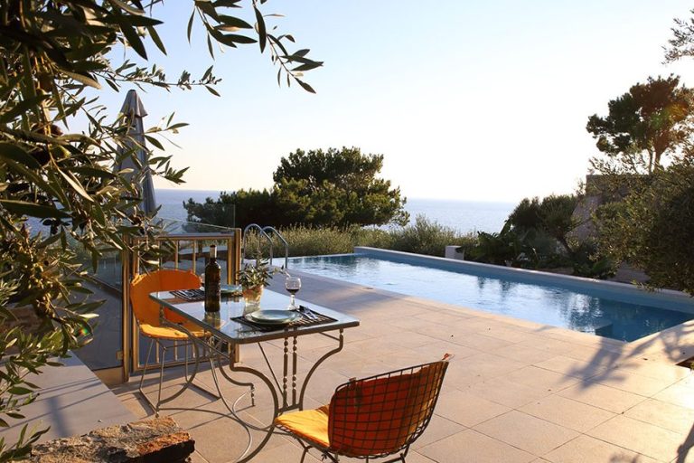 Vom Haus führt zwischen Olivenbäumen und Pinien ein kleiner Pfad direkt zum Meer an eine kleine Badebucht. Unterwegs befindet sich ein schattiger Sitzplatz unter Bäumen.