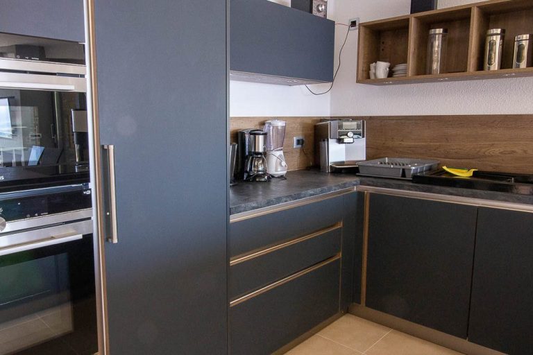 Die moderne und gut ausgestattete offene Einbauküche verfügt über Kühlschrank, Kaffee-Vollautomat, Spülmaschine, Backofen, Induktionsherd und Mikrowelle.