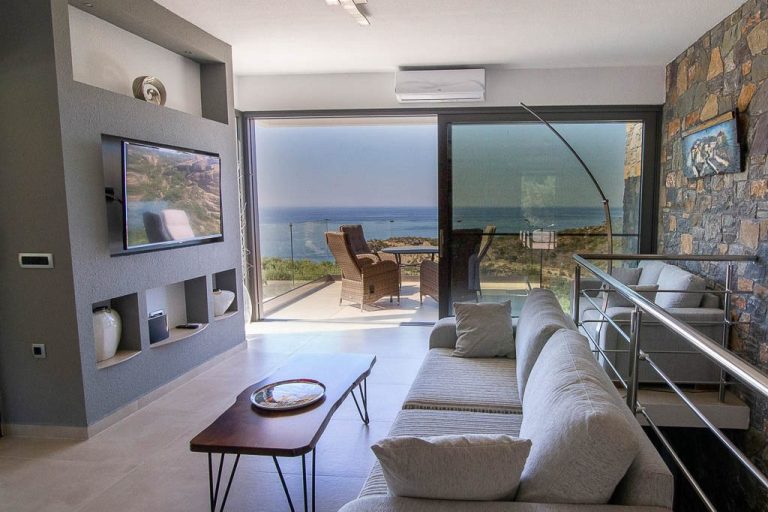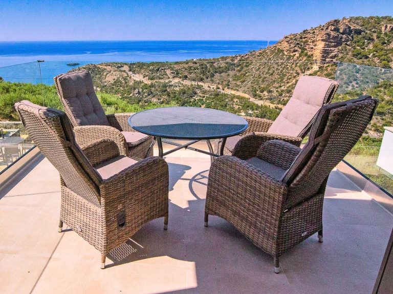 Das Haus hat 3 Schlafzimmer, 2 Bäder und einen geschmackvollen Wohn-Essbereich mit zwei bequemen Sofas, SAT-TV und Panoramablick auf die Küste.