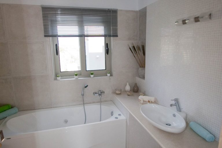 Es gibt ein Schlafzimmer mit Doppelbett und Einbauschrank und einen Whirlpool in vollverglaster Nische mit Blick auf das Meer und ein kleineres Schlafzimmer mit 2 Einzelbetten und Einbauschrank (Kinderzimmer).