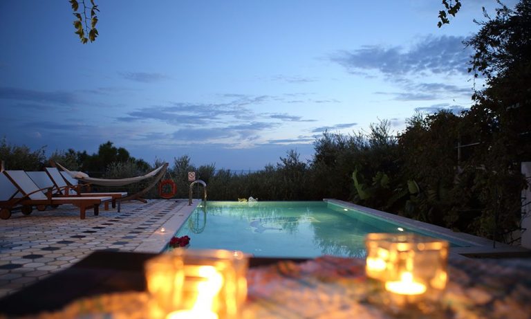 Die Veranda verfügt über Sitzgelegenheiten und am privaten modernen Salzwasserpool finden sich Sonnenliegen, Sonnenschirm und eine Außendusche.