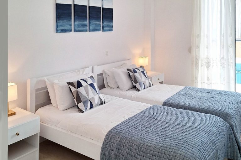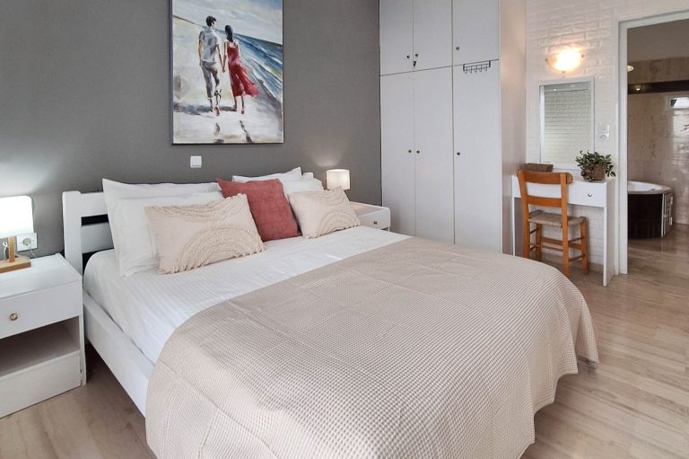 Im EG befindet sich der Eingang zu den drei Schlafzimmern, alle zur Pool- und Meerseite, ein großes Badezimmer mit Dusche, Jacuzzi-Badewanne, Waschtisch und WC und ein weiteres Bad mit Badewanne.