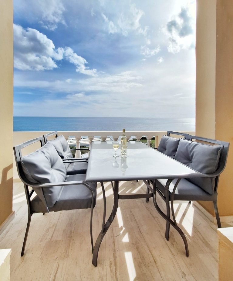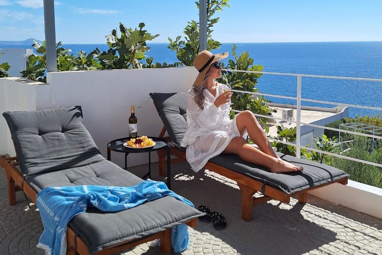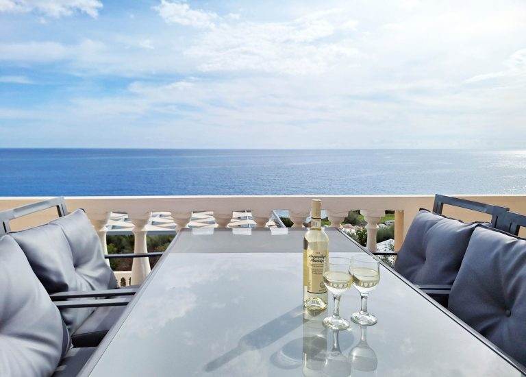 Der private Swimmingpool mit Sonnenliegen und schattiger Pergola und der traumhafte Meerblick lässt keine Wünsche offen.